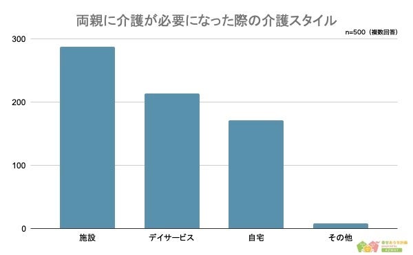 続いて「両親に介護が必要になった場合の介護スタイルについて」聞いたところ、1位が「施設(288人)」、2位が「デイサービス(214人)」、3位が「自宅(171人)」という結果になりました。