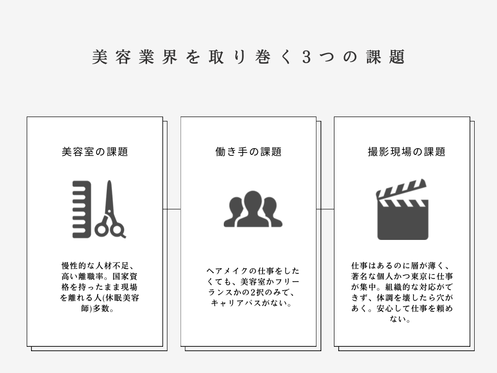 ヘアメイク師を発足するにあたって、美容業界を取り巻く以下の3つの課題に着目しました。