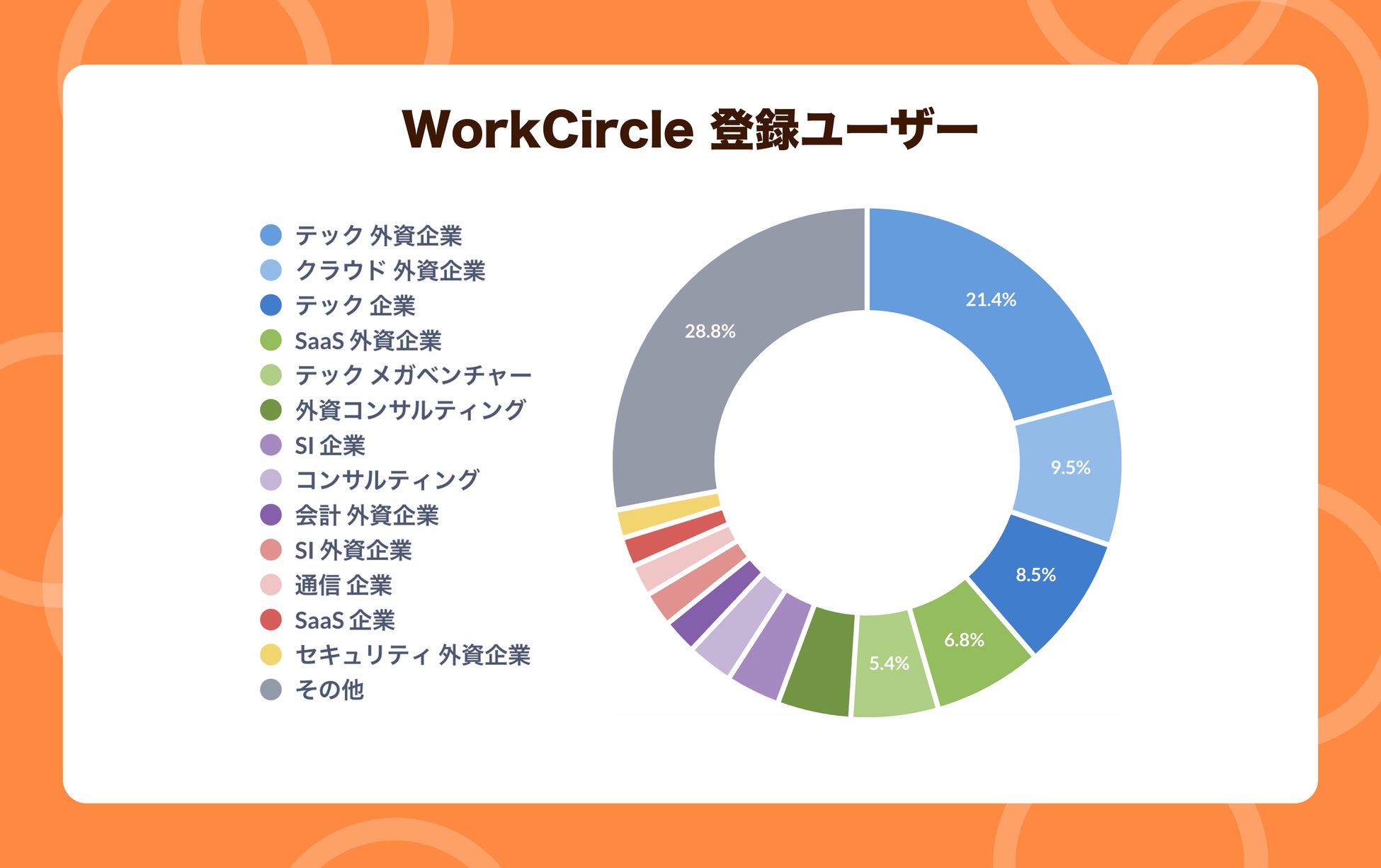 情報格差のリアルを継続的に提供してきたWorkCircleは2024年6月の時点で登録者は8,800人を超えており、登録ユーザーの半数以上が外資系企業に務める社員で構成されています。ビッグテックを始めとする有名企業からスタートアップ企業まで幅広いユーザーにご利用いただき、日頃から積極的な情報交換が行われていています。キャリア、年収、ライフイベントから資産運用まで、社内や人前では相談しづらいトピックが日々議論されています。