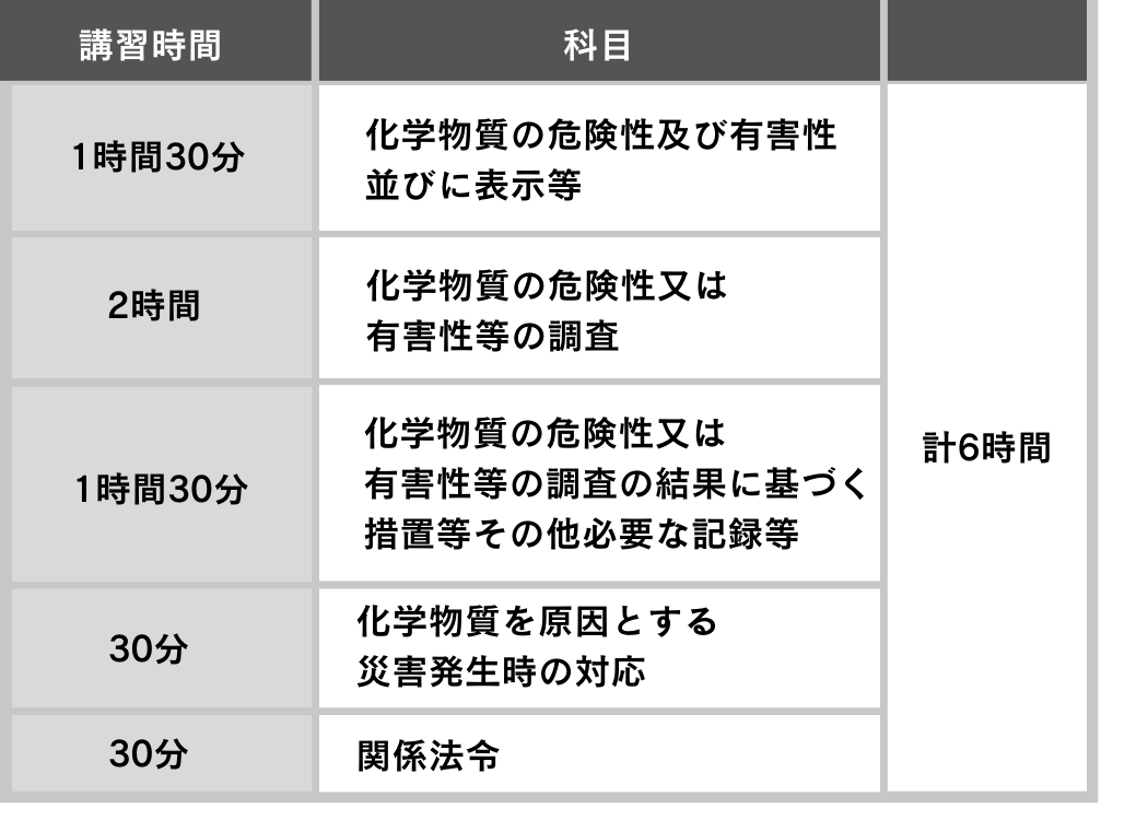本講習「化学物質管理者講習」は、リスクアセスメント対象物を取り扱う事業場(製造事業場以外)を対象に「化学物質管理者」として必要な知識と実務能力を習得していただくため、厚生労働省で定められた1日6時間のカリキュラムによる講習です。