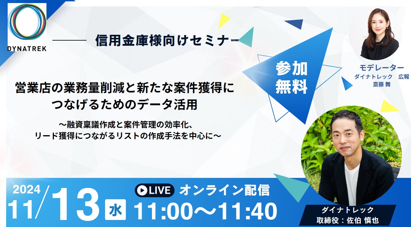 株式会社ダイナトレック(本社:東京都港区、代表取締役:佐伯 譲二、以下「ダイナトレック」)は、日本全国の約30の金融機関でのデータ統合・データ活用プロジェクトを展開しております。この度、それらの事例や経験をもとに、特別オンラインセミナーを開催いたします。