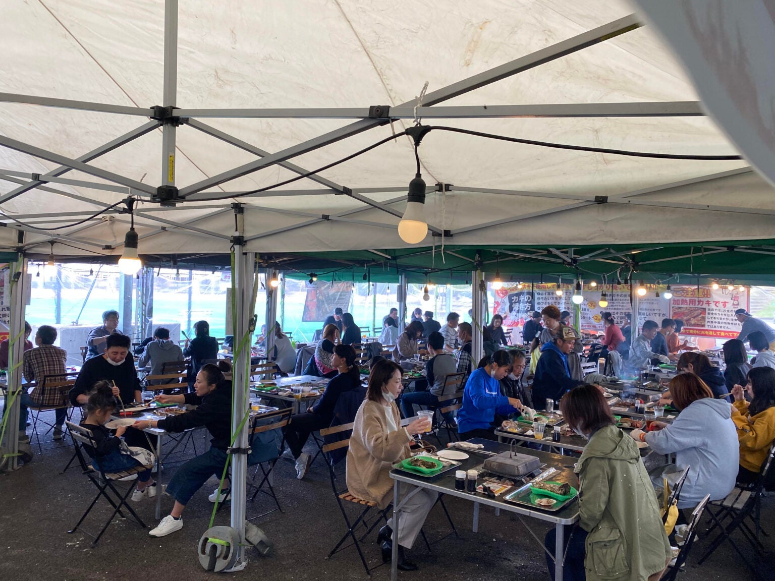 運営は地域活性・復興支援プロジェクト「かき小屋実行委員会」各店舗駐車場内の特設会場テントにテーブル、炭火焼きのコンロを設置し、利用客が自分で食材を焼くBBQスタイルを取っている。