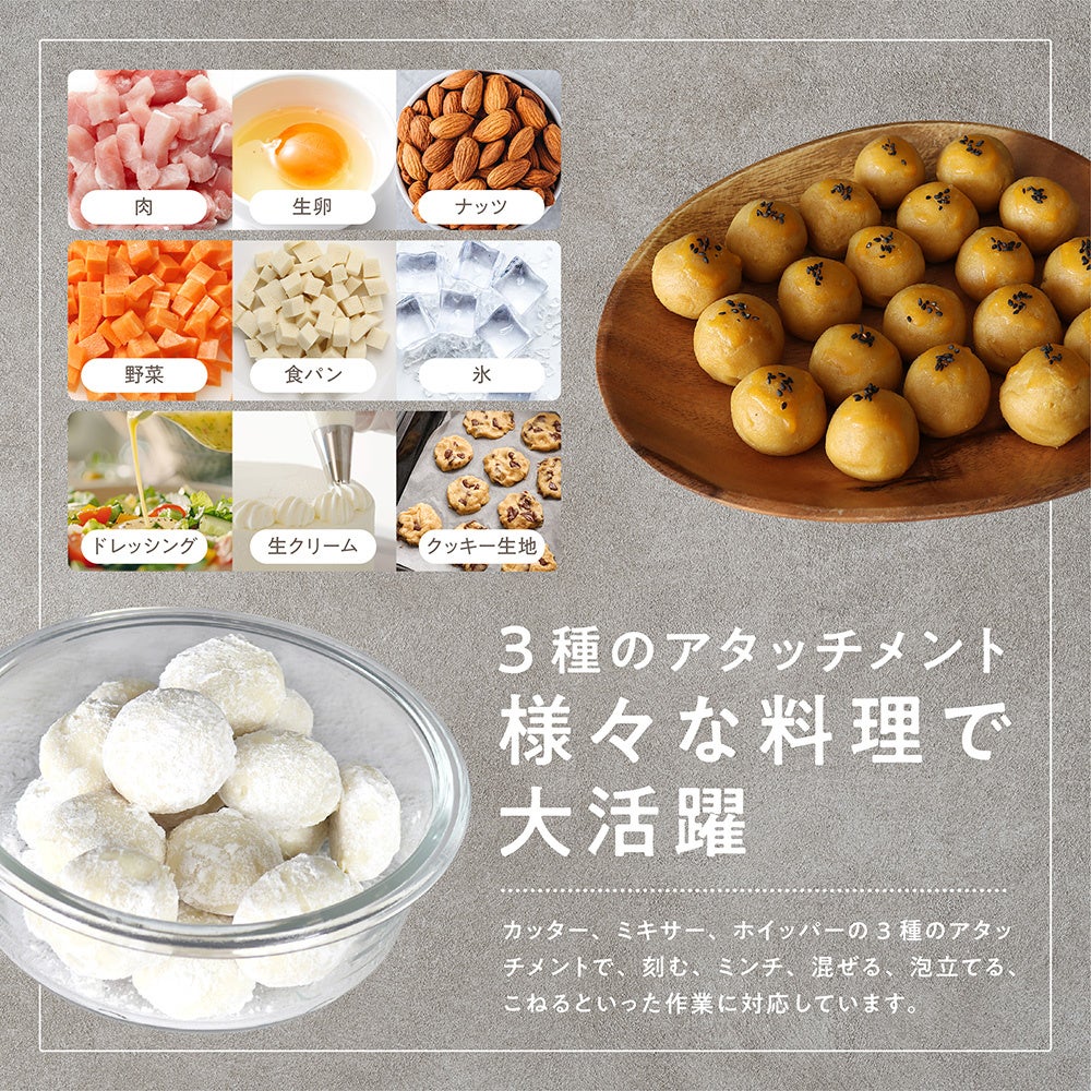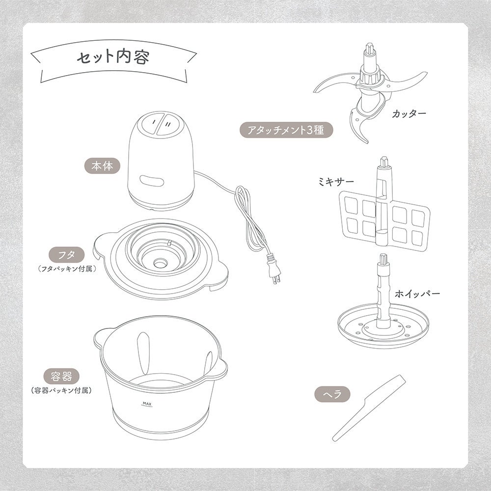 カッター・ミキサー・ホイッパー、3種のアタッチメント付属で、刻む・ミンチ・混ぜる・泡立てに対応できるフードプロセッサー。食材によって使い分けられる2モード搭載で、忙しい時でも手間をかけずスピーディーに調理が可能です。上下2層ブレードのカッターは、野菜のカットや肉をミンチ状にするだけでなく、氷も砕ける優れもの。乗せるだけのシンプル構造だから、セットもお手入れも簡単。丸みのある可愛らしいフォルムとグレージュの上品なカラーリングです。