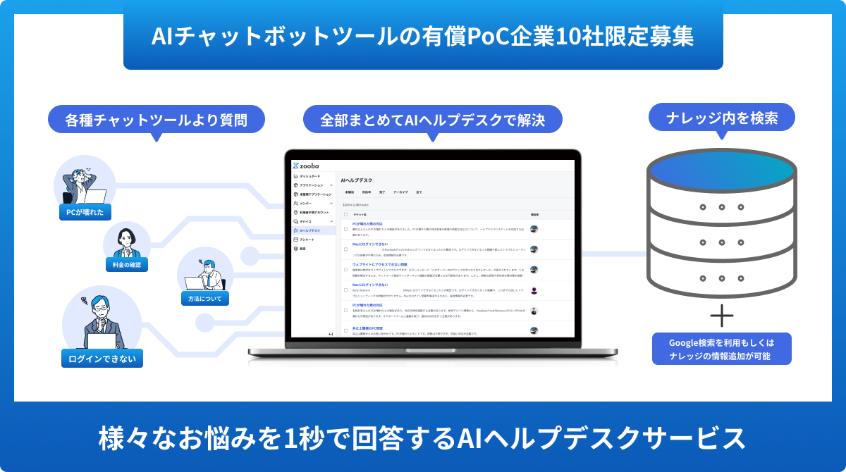 情報システム部の業務を効率化するという目的で作成されたzoobaですが、利用いただいているユーザー様からヘルプデスク業務を削減したいというお声が多数上がってきました。 顧客へのインタビューを実施した結果、「ヘルプデスク業務が属人化している」「ヘルプデスク業務が差し込みで入ることで集中力が切れる」などが課題であることがわかりました。その課題をAIヘルプデスクが解決するべく、サービスの提供を開始します。