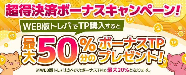 キャンペーン期間中に、WEB版およびアプリ版(iOS版・Google Play版・Nintendo Switch版・Amazon Fire TV版)で決済を行った際にボーナスTP(トレバポイント)をプレゼント!