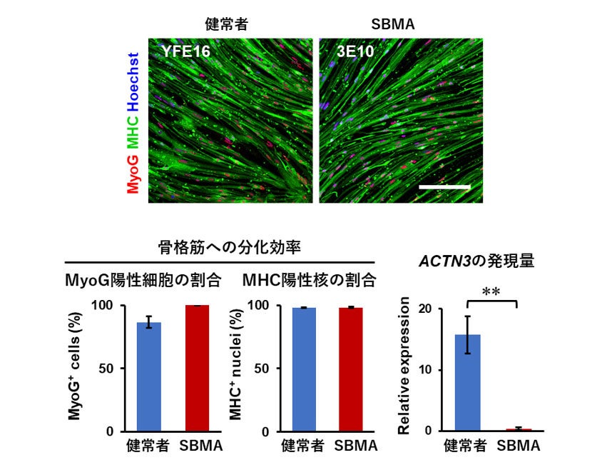 この方法を用いて、球脊髄性筋萎縮症(SBMA)患者由来iPS細胞を骨格筋へと分化誘導したところ、健常者株と同様に高効率に骨格筋へと分化誘導可能でした。また、健常者iPS細胞由来骨格筋に比べて速筋のマーカーであるACTN3※10遺伝子の発現が低下していることを見出しました。この結果は、SBMA患者由来骨格筋で見られる変化は、SBMA患者やSBMAモデルマウスでみられている速筋の減少をよく反映していると考えられました(図2)。したがって、この分化誘導法は疾患解析にも応用可能であることが示されました。