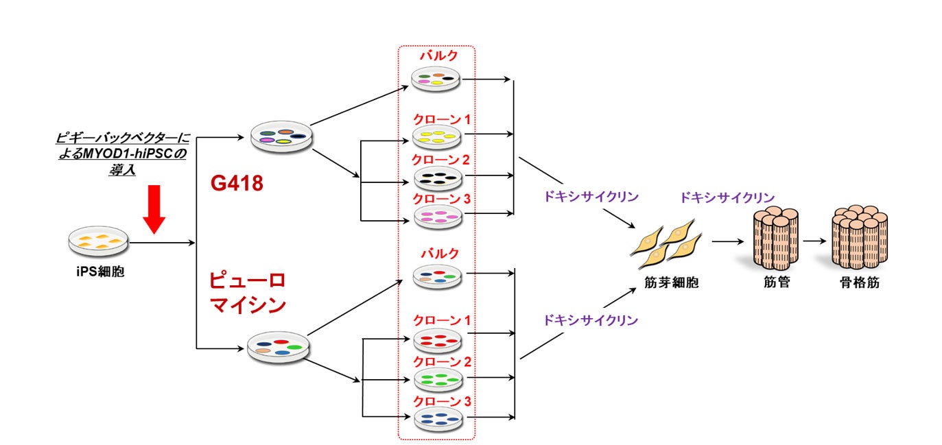 我々は、ヒトiPS細胞にドキシサイクリン誘導型MYOD1遺伝子を導入し、抗生物質であるピューロマイシンによる薬剤選択を行い、ドキシサイクリン誘導性にMYOD1を発現するヒトiPS細胞株(MYOD1発現ヒトiPS細胞:MYOD1-hiPSC)を作製しました(図1)。その結果、従来行ってきたクローン選択を行わなくても、バルク培養※7で作製したMYOD1発現ヒトiPS細胞から、高効率(80%以上)に、Myogenin(MyoG)※8陽性およびミオシン重鎖(MHC)※9陽性骨格筋細胞を分化誘導し得ることを見出しました。また、バルク培養で作製したMYOD1発現ヒトiPS細胞を用いることで、クローン間のばらつきを最小限に抑えられる可能性があることを見出しました。
