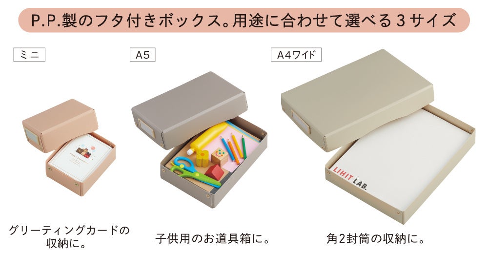 汚れてもサッと拭けるP.P.素材のフタ付きボックスです。小さな雑貨からA4クリヤーホルダー・角2封筒まで、収納物に合わせて選べる3サイズ(ミニ・A5・A4ワイド)をご用意しました。小さいサイズの本体とフタを大きいサイズの本体の中に入れて、仕切りとして使用できます。ラベリングができる見出しとカットして使えるスペア見出し紙が付属しています。