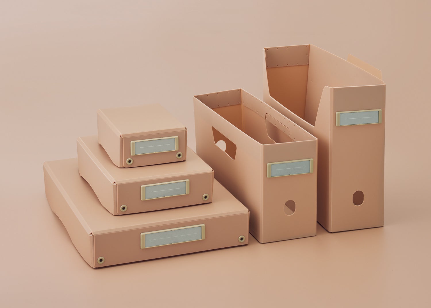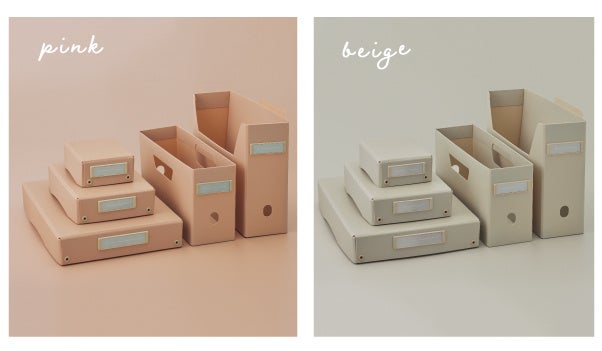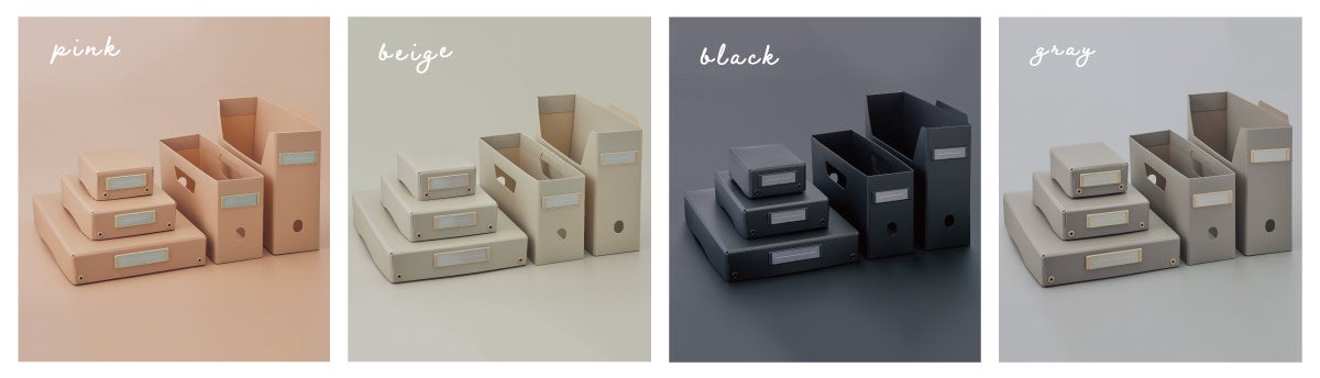 インテリアに馴染むベージュ、ピンク、グレー、ブラックのニュアンスカラーを採用した収納シリーズです。
