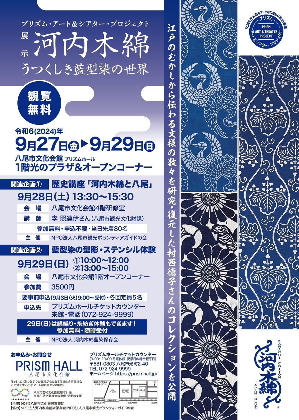 八尾市文化会館プリズムホール(指定管理者:公益財団法人八尾市文化振興事業団)では、八尾市文化会館の舞台だけでなく共用スペースなど様々な場所を用いてパフォーマンスや展示のイベントを行い、にぎわいと交流を生み出すことを目的とした”プリズム・アート&シアター・プロジェクト”事業を展開しています。この事業の一環として、今回は八尾発の工芸として注目を集める「河内木綿」をテーマにした展示を地元のNPO法人河内木綿藍染保存会の協力により実施します。