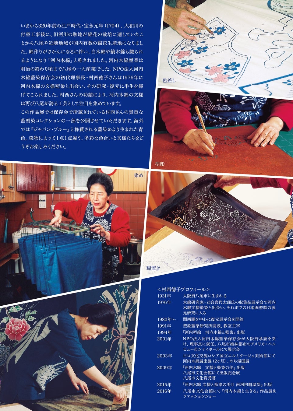 NPO法人河内木綿藍染保存会の初代理事長・村西德子さんは1976年に河内木綿の文様藍染と出会い、その研究・復元に半生を捧げてこられました。村西さんの功績により、河内木綿の文様は再び八尾が誇る工芸として注目を集めています。