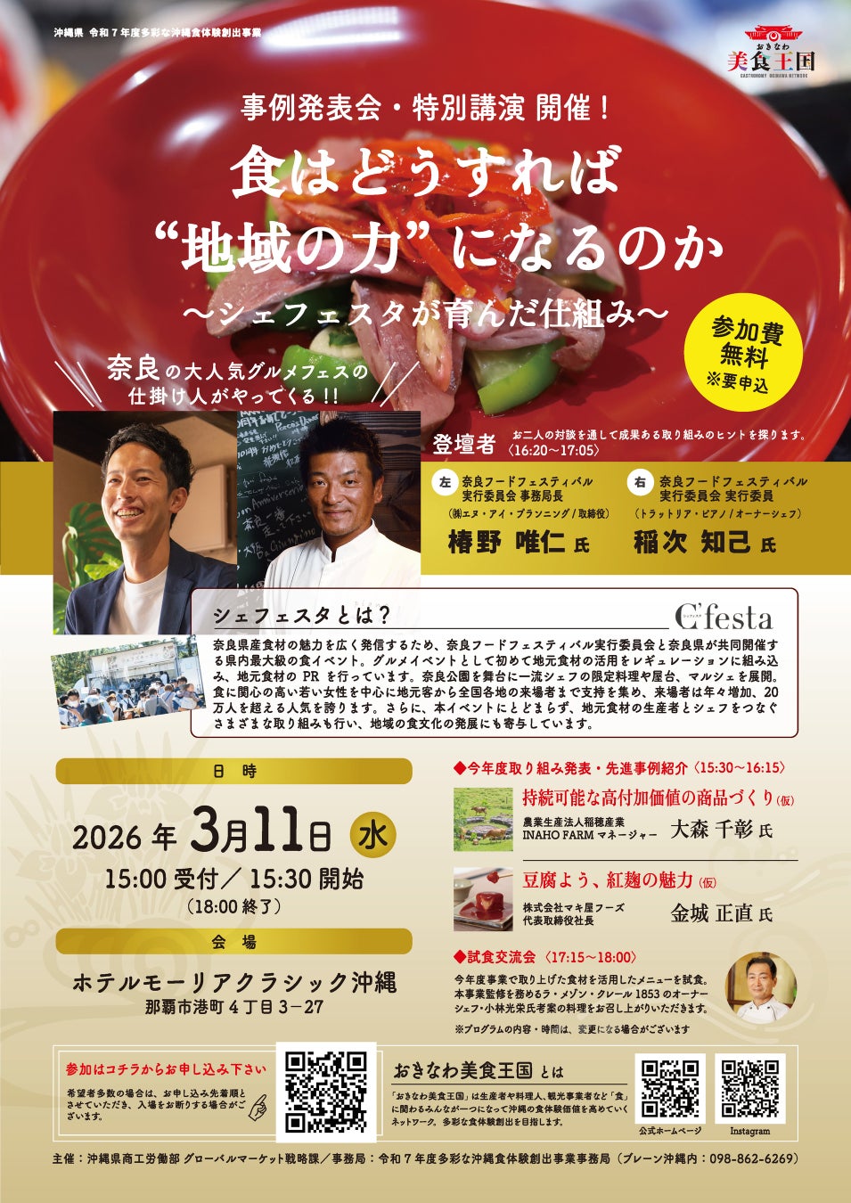 2026年3月11日(水)、「沖縄県 令和7年度多彩な沖縄食体験創出事業」の取り組みを紹介する事例発表会を開催します。奈良県最大のフードフェス「シェフェスタ」の仕掛け人による貴重な対談も実施します。