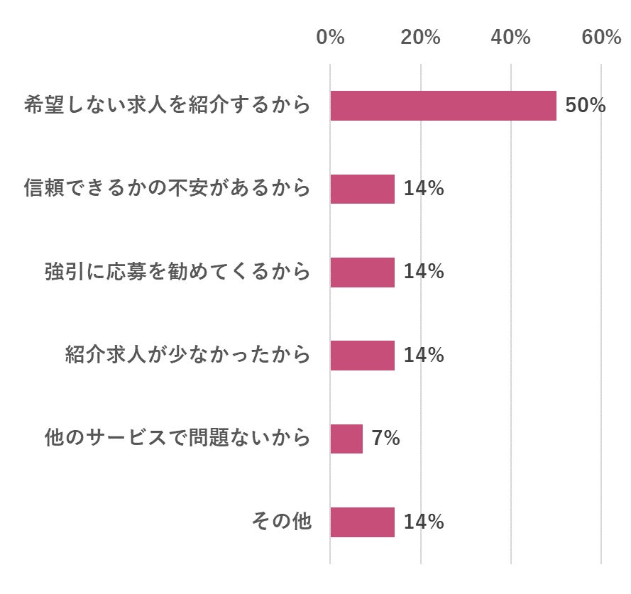 希望してない職種の求人も紹介されて煩わしいため。(20代 女性) |