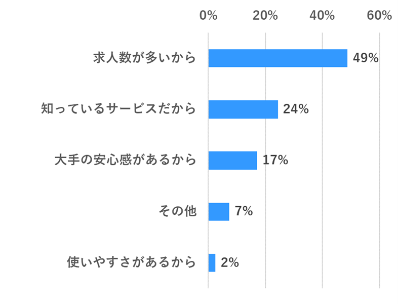 一番メジャーなものとして認識していました。転職関係のサービスならまずこれが思い浮かびました。そのくらい身近なものなので、信用しても安全かと想いました。知人に利用した者もいて、そちらから勧めも受けたから。全国広くをカバーしているので使用価値があると思ったから。(30代 男性) |