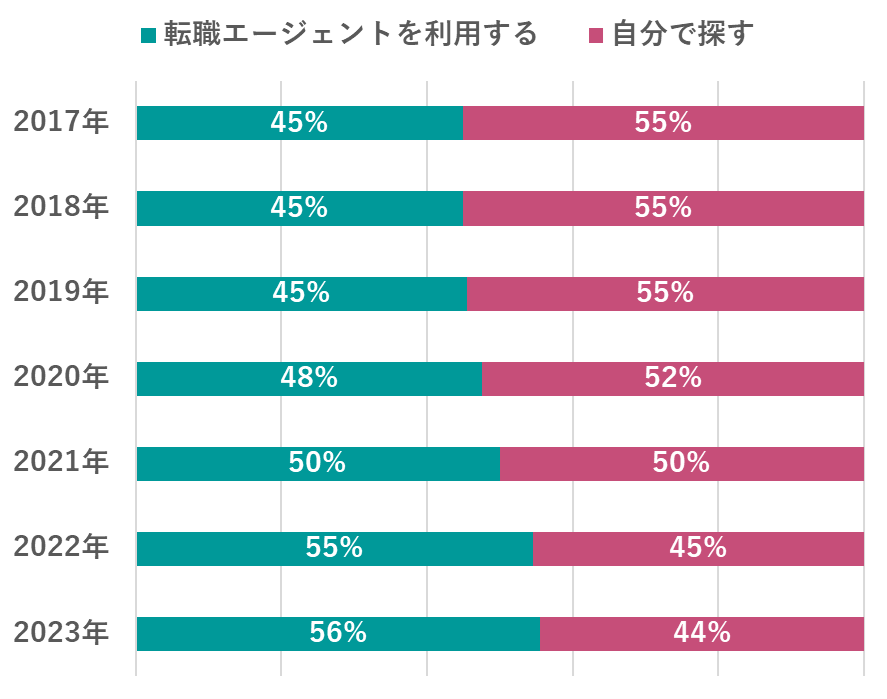2022年から、「転職エージェントを使う」と答える人の割合がやや増加していることが確認できます。