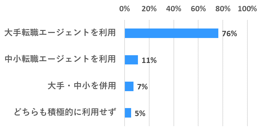 「転職エージェントは、『大手・中小』どちらを優先して利用しますか?」のアンケートでは、8割近くの人が「大手転職エージェントを利用する」と回答する結果となりました。