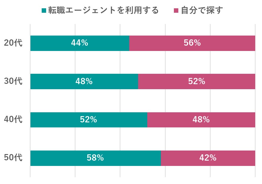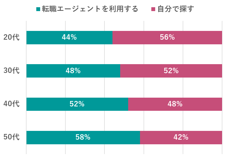 アンケート結果からは、年齢が上がるにつれて転職エージェントを利用する人の割合が高まる傾向が見られました。