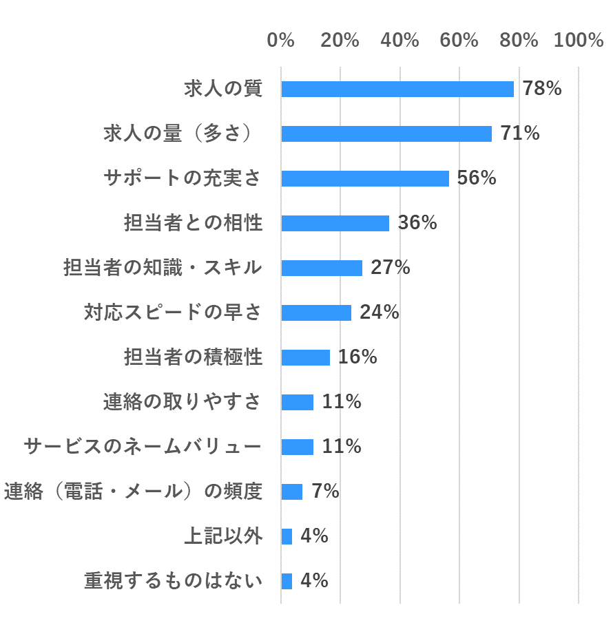 最も多かったのが「求人の質」の78%、次いで「求人の量(多さ)」が71%、「サポートの充実さ」56%となっています。
