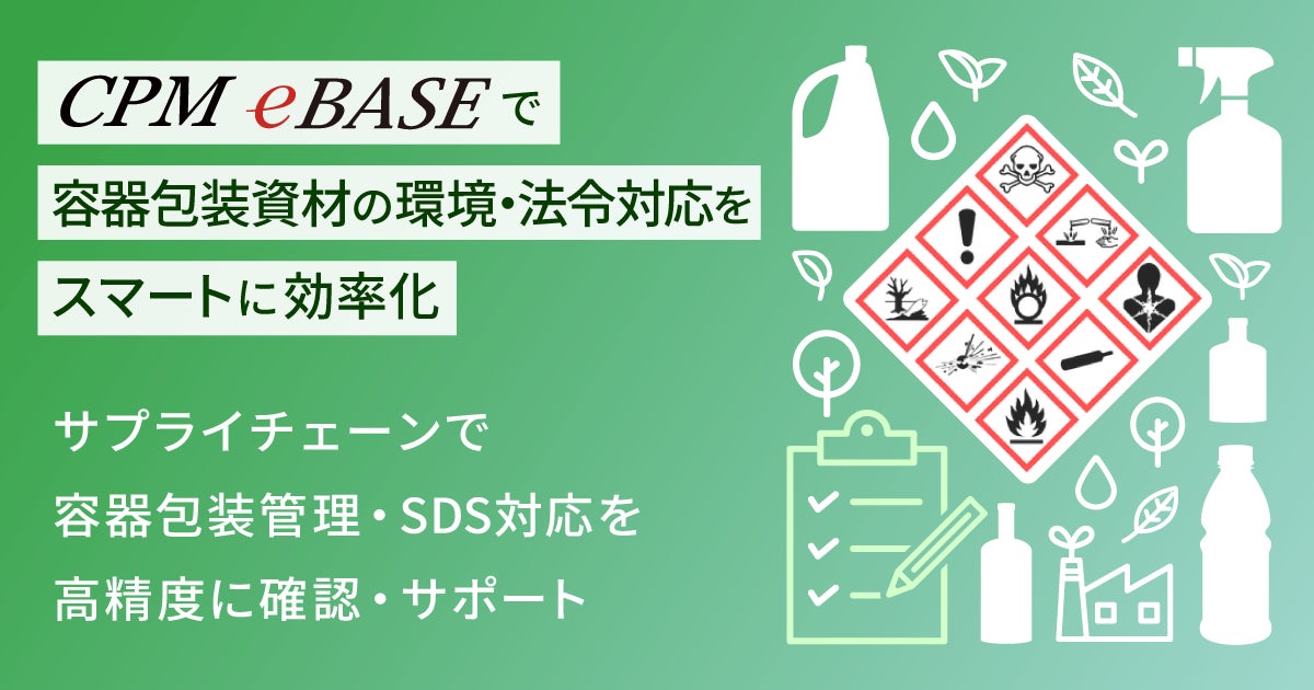 「CPM eBASE」は、容器包装資材環境情報管理システム「eB-Esg」とSDS管理システム「eB-SDS」をはじめとする2つの主要ソフトが、環境負荷の可視化、資源利用の最適化、法令遵守、SDS電子化など、企業の持続可能な事業運営を支援します。