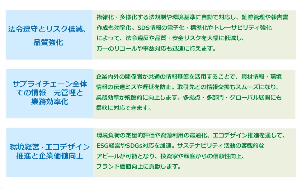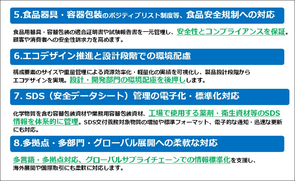 「CPM eBASE」は、環境負荷の定量的評価や資源利用の最適化、法令対応、エコデザイン推進など、容器包装管理に関わるさまざまな課題に対応できるよう設計されています。加えて、近年急速に変化する化学物質管理の現場ニーズに応え、SDS(安全データシート)の電子化・標準化対応も強化しています。製造業や容器包装資材業界における情報管理の煩雑さや、環境・法規制対応の複雑化といった現場課題を解決し、企業の持続可能な事業運営を支援します。