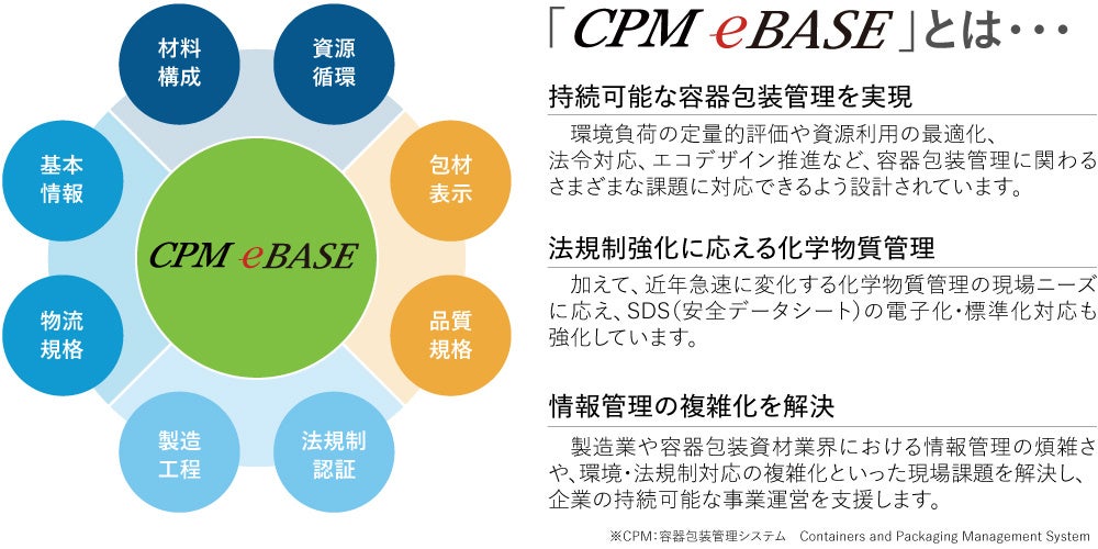 「CPM eBASE」は、環境負荷の定量的評価や資源利用の最適化、法令対応、エコデザイン推進など、容器包装管理に関わるさまざまな課題に対応できるよう設計された情報管理プラットフォームです。