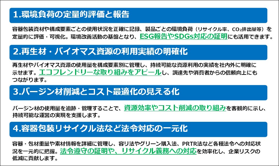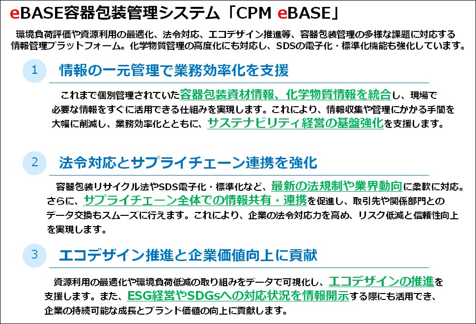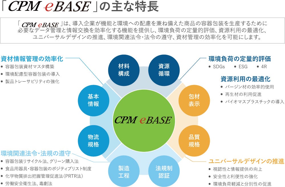 「CPM eBASE」は、導入企業が機能と環境への配慮を兼ね備えた商品の容器包装を生産するために必要なデータ管理と情報交換を効率化する機能を提供し、環境負荷の定量的評価、資源利用の最適化、ユニバーサルデザインの推進、環境関連法令・法令の遵守、資材管理の効率化を可能にします。