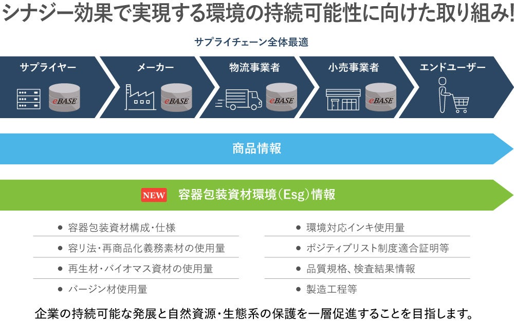「eB-Esg」は、企業の環境負荷の大きな割合を占める容器包装資材のサステナビリティ情報を一元管理し、企業間の商品情報交換の標準化を支援します。