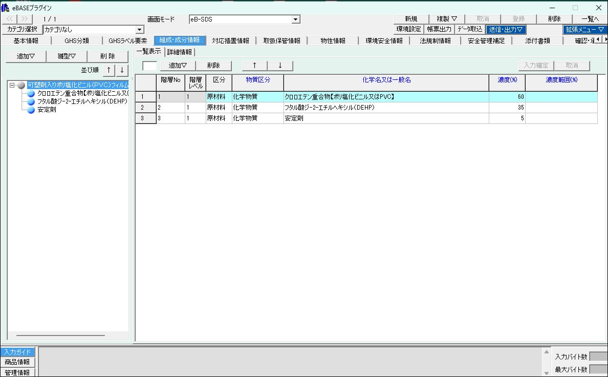 「eB-SDS」の画面イメージ例(可塑剤入りポリ塩化ビニル(PVC)フィルム例)