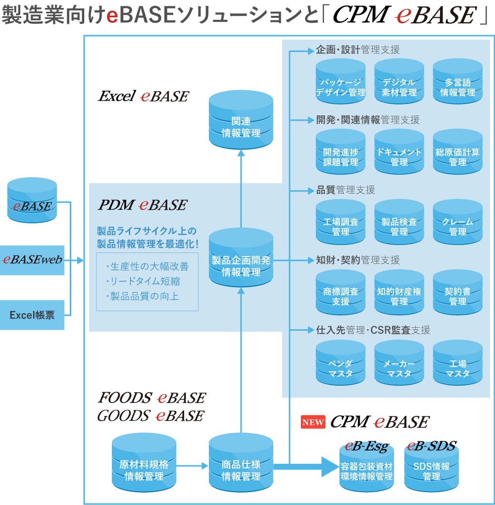 また、この容器包装管理システム「CPM eBASE」は、製造業(メーカー)や小売業のPB(Private Brand)商品の企画開発支援システム「PDM eBASE」や詳細(品質)情報管理システム「FOODS/GOODS eBASE」、及び各種関連情報として存在するEXCEL帳票群のデータベース管理「Excel eBASE」に加えて、新たに容器包装における環境・法規制管理ソリューションとして開発いたしました。「CPM eBASE」は、容器包材資材環境情報管理システム「eB-Esg(※2)」と安全な化学物質の取り扱いによる労働環境の保護を目的としたSDS情報管理システム「eB-SDS(※3)」の2つのシステム構成で実現しています。