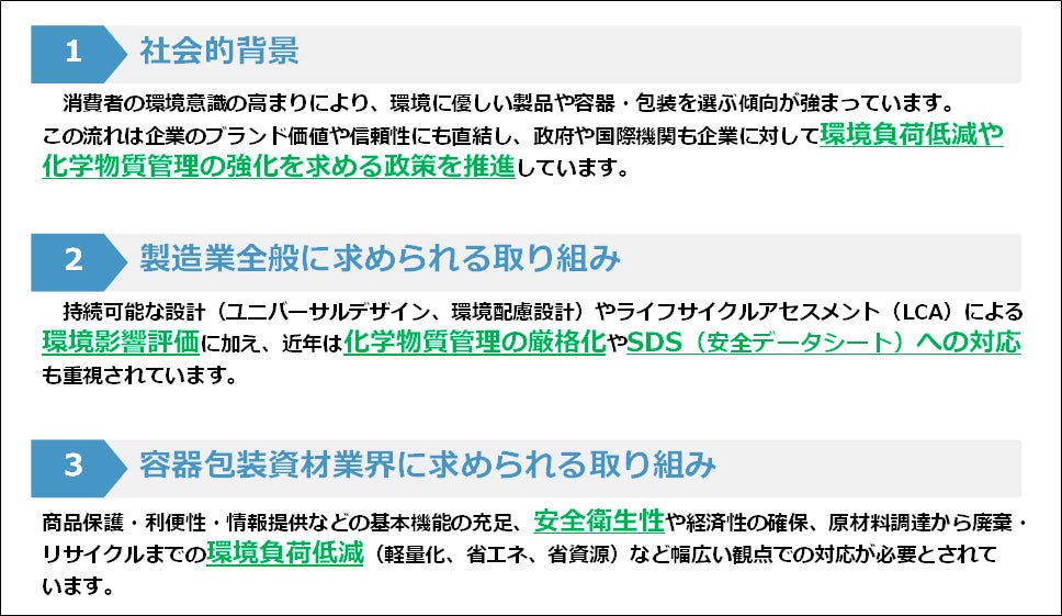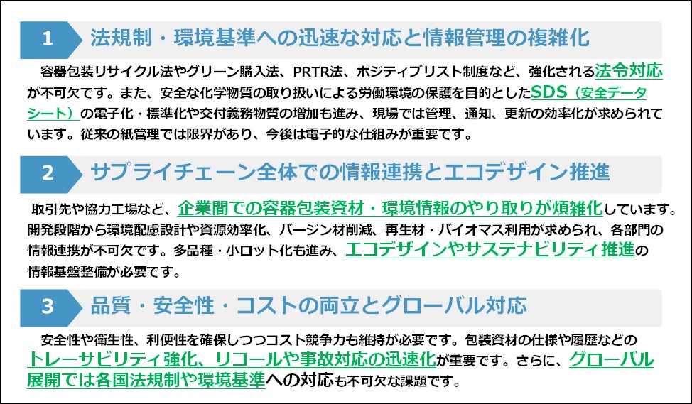 近年、環境問題への関心が世界的に高まる中、製造業や容器包装資材業界においても、商品の安全性や利便性を確保しながら、持続可能性や環境負荷の低減、資源循環の推進が一層求められています。また、化学物質管理の厳格化やSDSの電子化・標準化といった新たな法規制対応も、現場の重要な課題となっています。