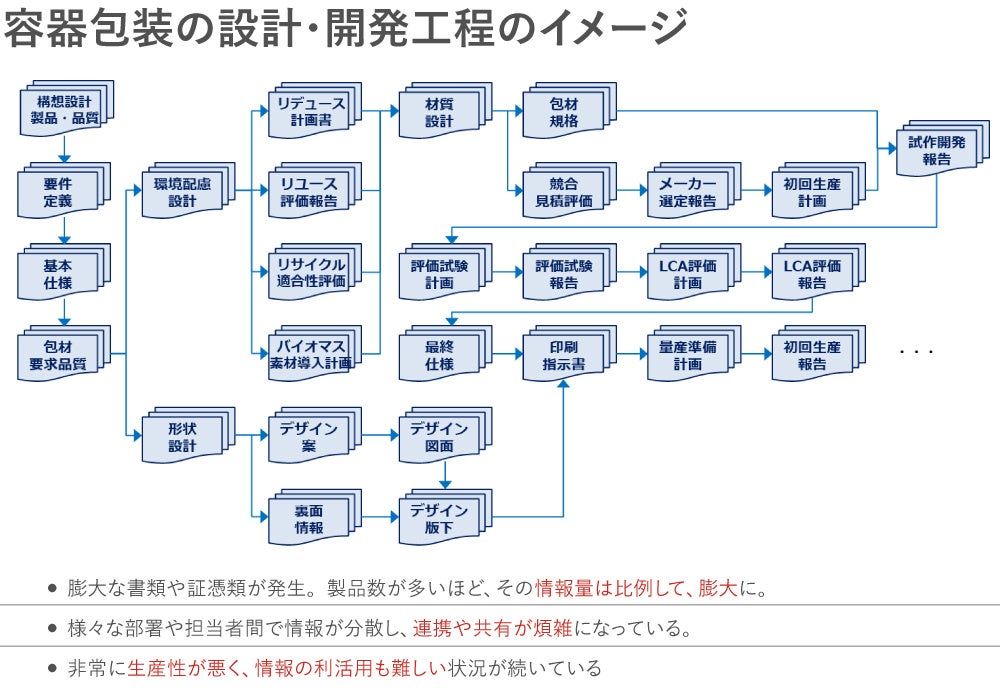 製造業や容器包装資材業界の設計・開発工程では、膨大な書類や証憑類の管理が日常的に発生しています。製品数が増えるほど比例して情報量や管理負担も増大し、現場の負担は非常に大きなものとなっています。さらに、多くの部署や担当者が関与することで情報が分散しやすく、社内の情報共有や取引先・外部パートナーとのやり取りも煩雑化。その結果、関係者間での情報連携や内容確認の作業に多くの手間と時間を要し、生産性が低下し、蓄積された情報の利活用も難しい状況が続いています。