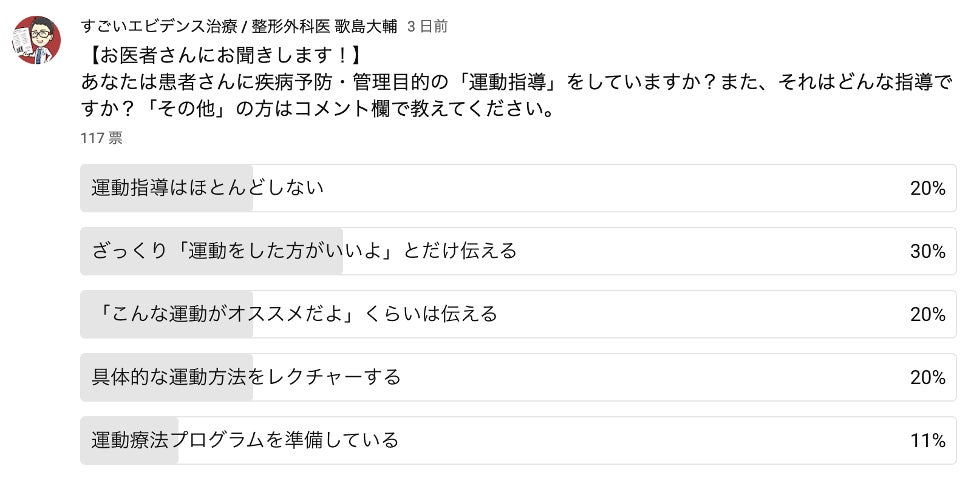 整形外科専門医の歌島大輔が運営するYouTubeチャンネル「すごいエビデンス治療 | 整形外科医 歌島大輔」にて、【お医者さんにお聞きします!】という前置きで、アンケートを実施しました。質問は「あなたは患者さんに疾病予防・管理目的の「運動指導」をしていますか?また、それはどんな指導ですか?」というものであり、その回答は興味深いものでした。