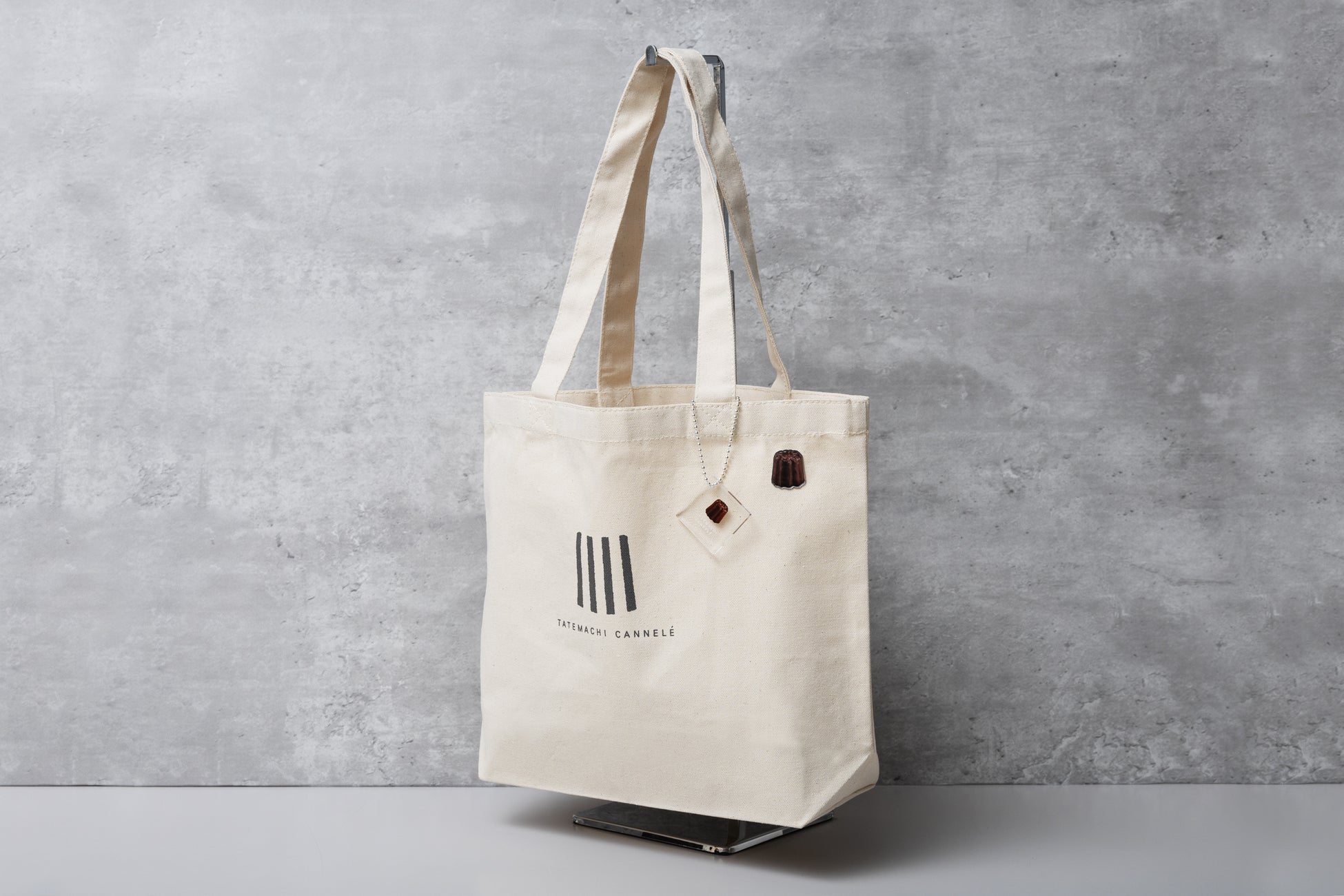 立町カヌレのロゴが入ったトートバッグです。しっかりした生地でシンプルなデザインのこのトートは、使い勝手抜群。マチもあるのでカヌレ8個セットを入れて贈り物にするもオススメです。ランチ時やちょっとしたお出かけ時にも活躍します。