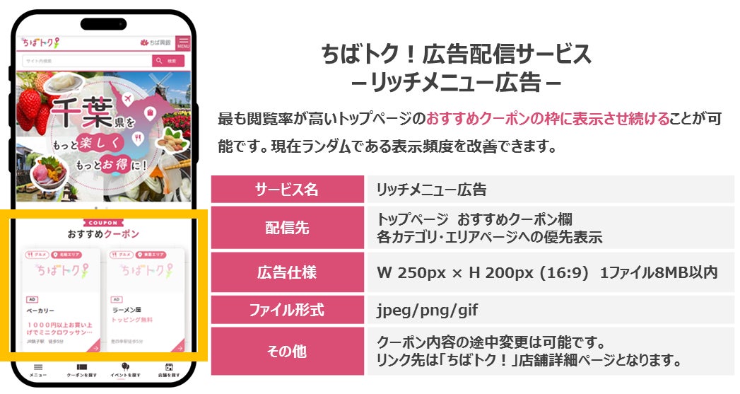 月間アクティブユーザー数最大約7万人、アクセス件数約18万4千の「ちばトク!」において最も閲覧率が高いトップページに、法個人問わず少額で広告をご掲載いただけます。また、サムネイル画像等、掲載する広告素材をお持ちでないお客さまにおかれましては、制作代行を当行にて承ります。
