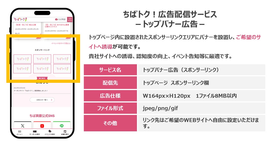 株式会社千葉興業銀行(頭取 梅田 仁司)は、ステークホルダーのみなさまの情報発信力強化のため、コミュニティサイトである「ちばトク!」(https://chibatoku.chibakogyobank.com/)内へ広告枠を設置いたします。