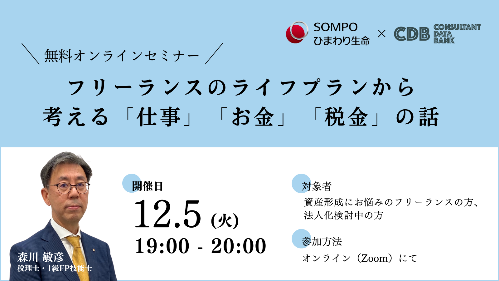 フリーランスがもっと活躍できる社会へ。コンサルデータバンク×SOMPOひまわり生命『フリーランスのライフプランから考える「仕事」「お金」「税金」の話』12/5(火)19:00 無料Webセミナー開催!