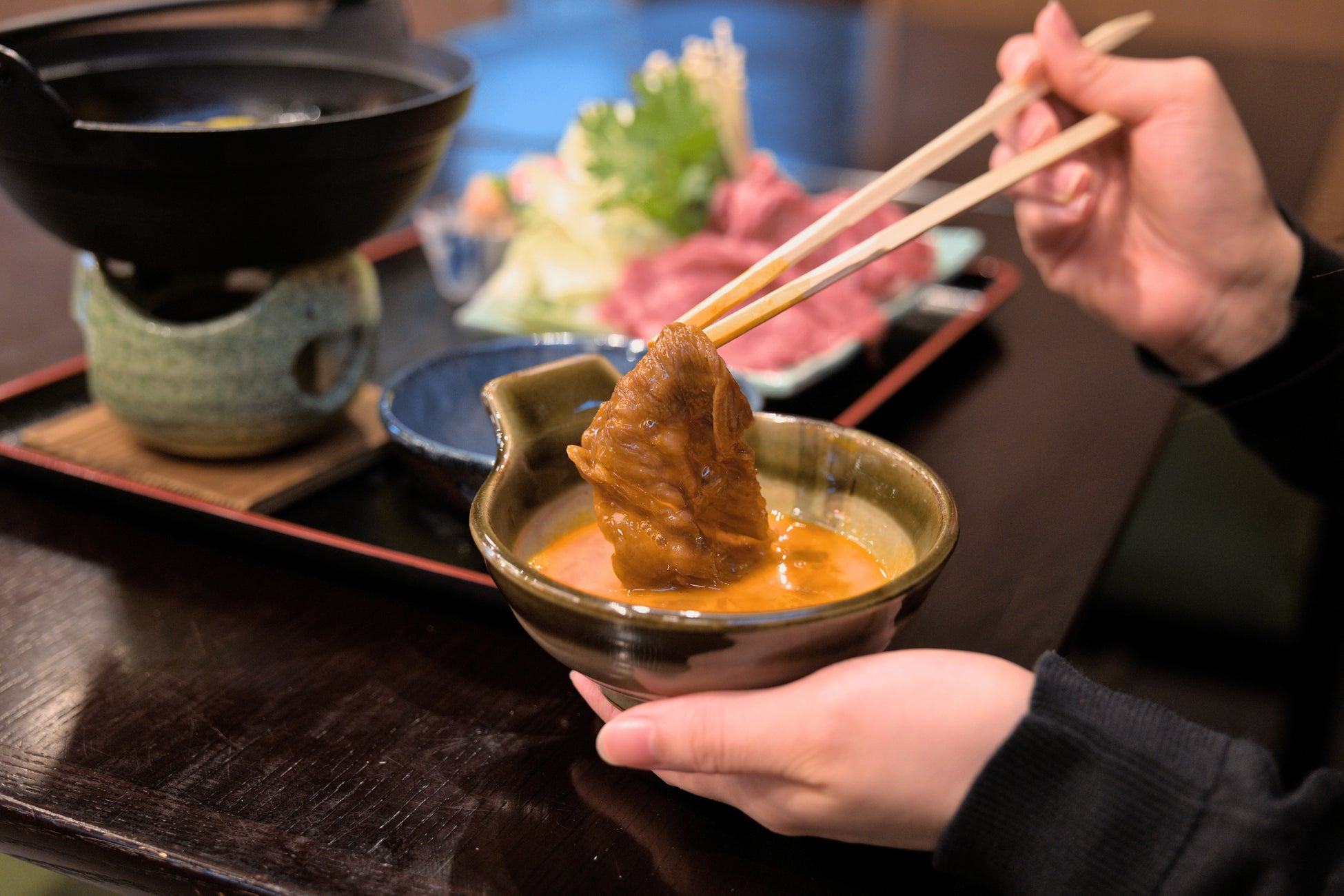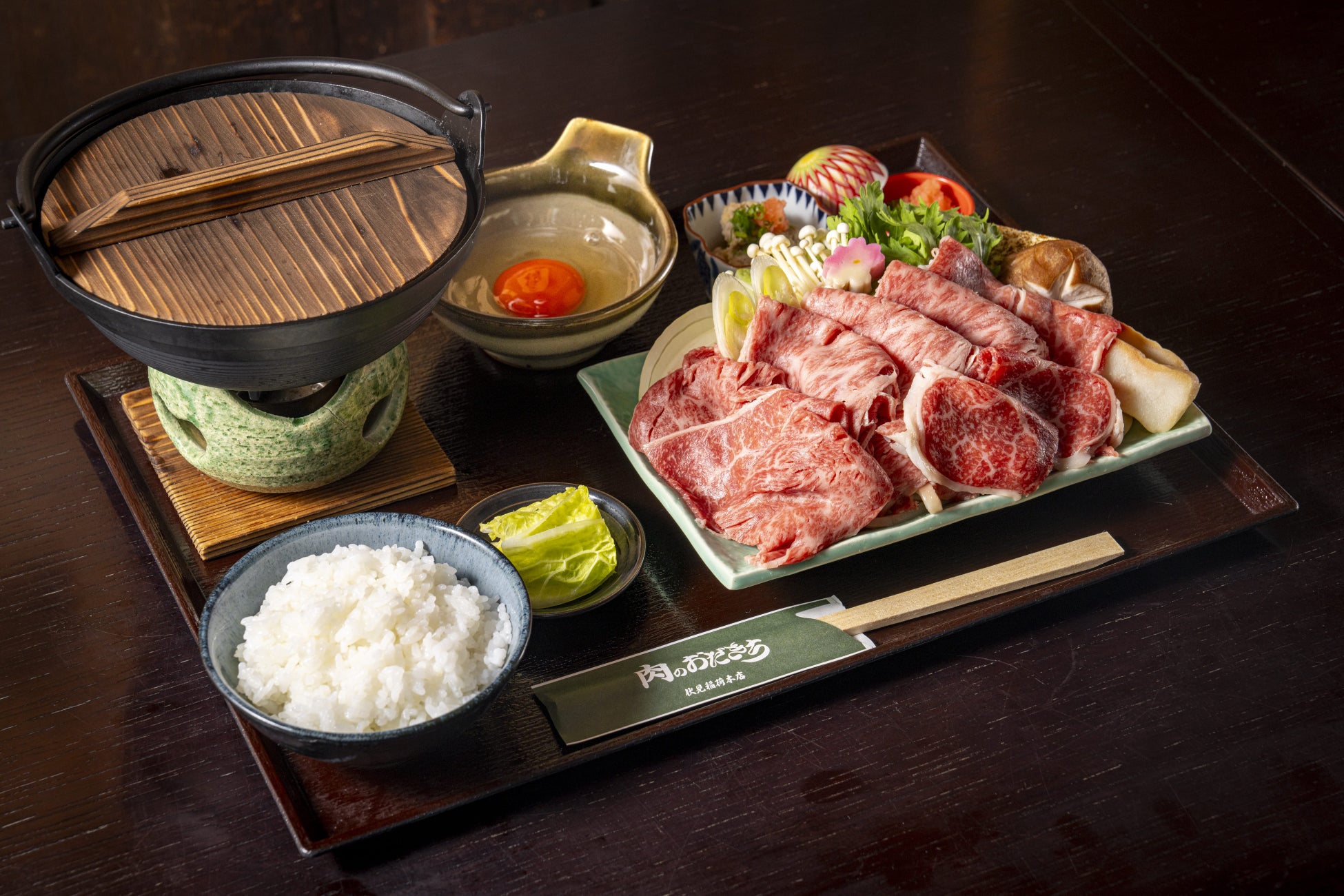 上質な黒毛和牛の脂の旨みが引き立つ特製の割下で、新鮮な野菜と一緒に煮込まれた和牛は、柔らかく、口の中でとろけるような旨みを堪能できます。秘伝の割下は、釜で炊き上げたふっくらご飯との相性も抜群です。