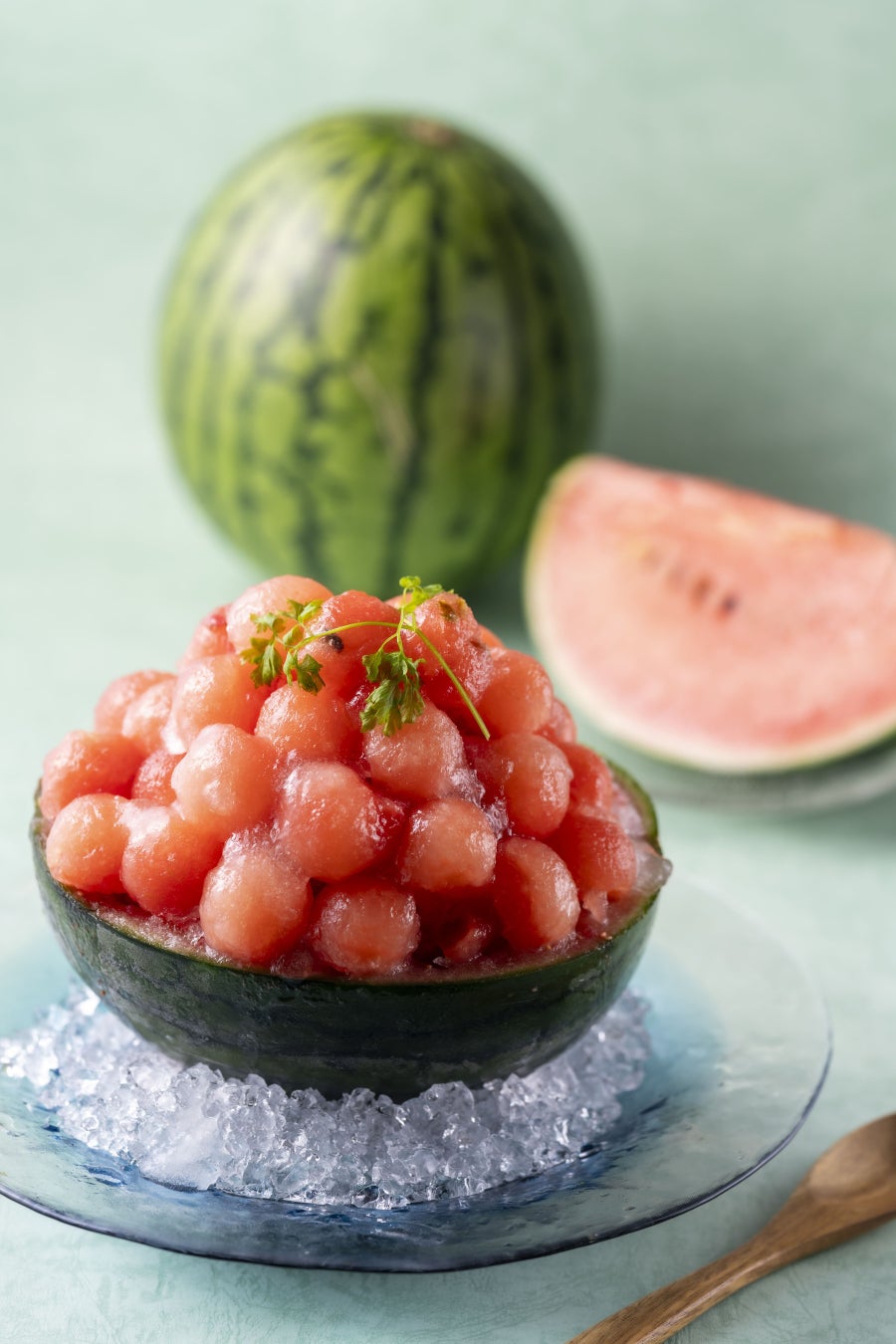 半分に切ったスイカを器として使用し、ふわふわの氷の上に丸くくり抜いた果肉をたっぷり盛りつけました。スイカの果肉とシロップが絶妙にマッチし、ひんやりとした口当たりが特徴です。見た目もインパクト抜群、この夏のひとときを特別に彩る一品です。夏の暑さを吹き飛ばす爽やかなデザートをぜひご賞味ください。