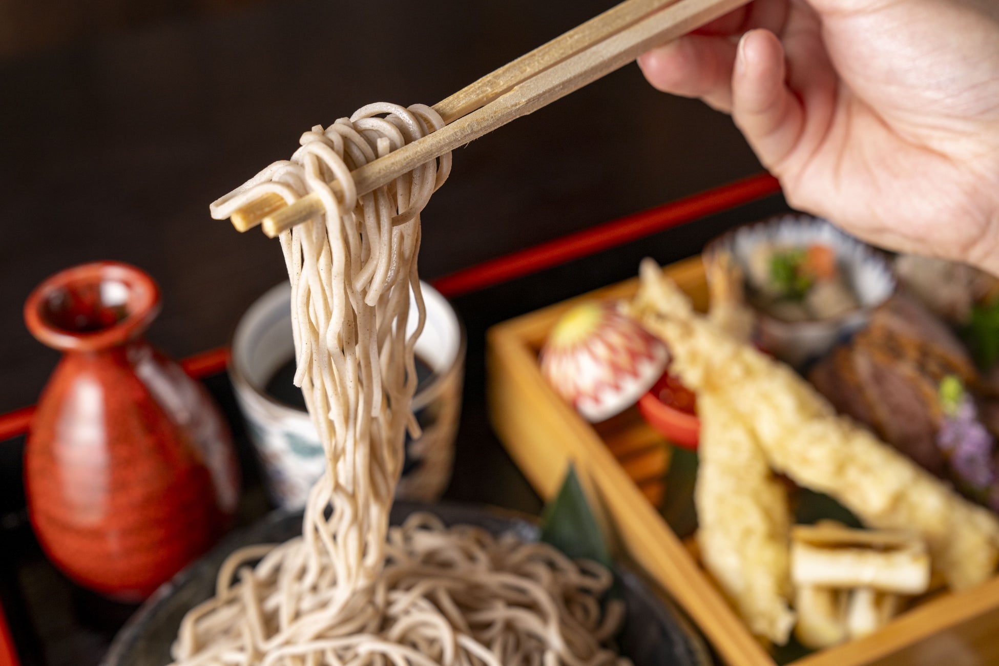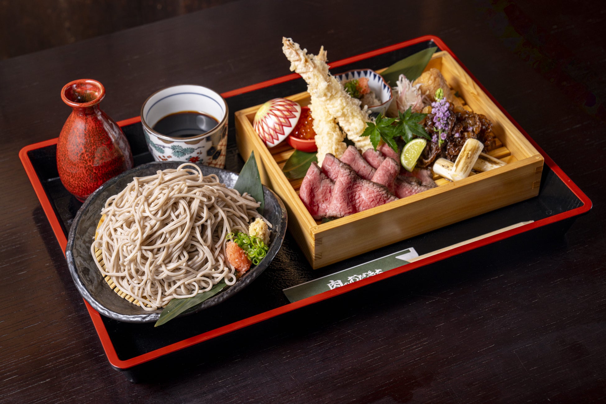 和牛の旨みを凝縮したローストビーフは、上品な旨味が口いっぱいに広がります。サクサクの海老天ぷらと共に、風味豊かな蕎麦をお楽しみください。