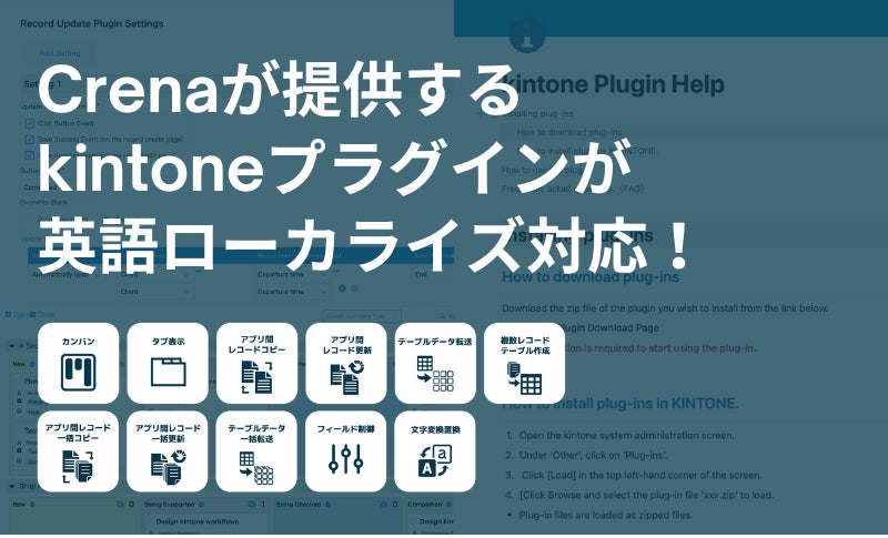 国内でのkintoneプラグイン販売実績800件以上!Crenaが提供する11種類のkintoneプラグインが英語ローカライズ対応。英語マニュアルと英語でのWeb説明環境を整え、海外進出へ。