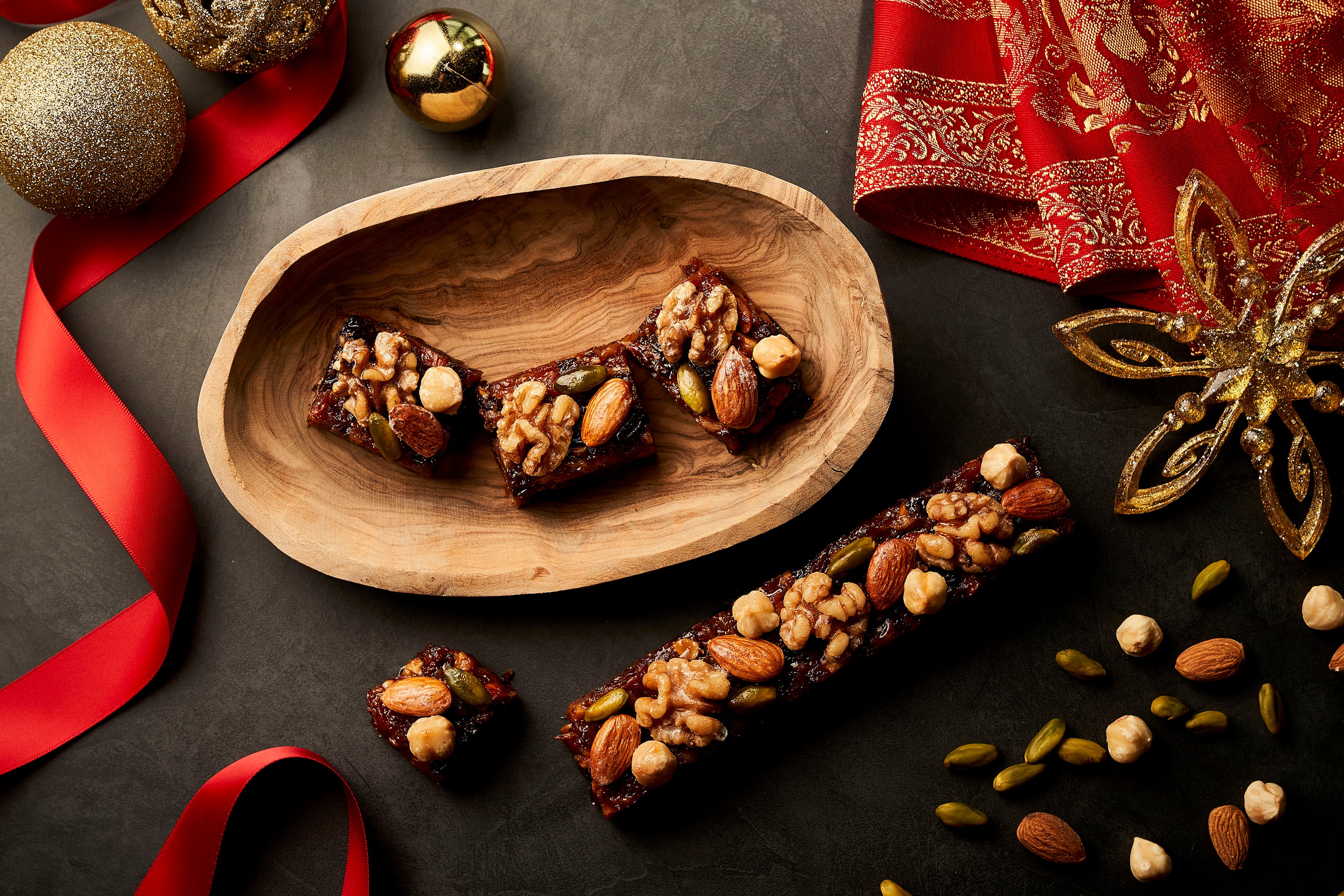 ベラベッカとは、フランス・アルザス地方に伝わるクリスマスを代表する伝統的なお菓子で「洋ナシのパン」を意味します。キルシュと呼ばれるフルーツブランデーの1種に漬け込んだドライフルーツの洋ナシを中心に、10種類以上のミックスフルーツやナッツをふんだんに使用し、濃厚な味わいと食べ応えを楽しめるスイーツです。一般的にナッツは生地の中に混ぜ込まれますが、センタラではさらにナッツを表面に並べることで、食感も楽しく見た目にも美しく仕上げました。