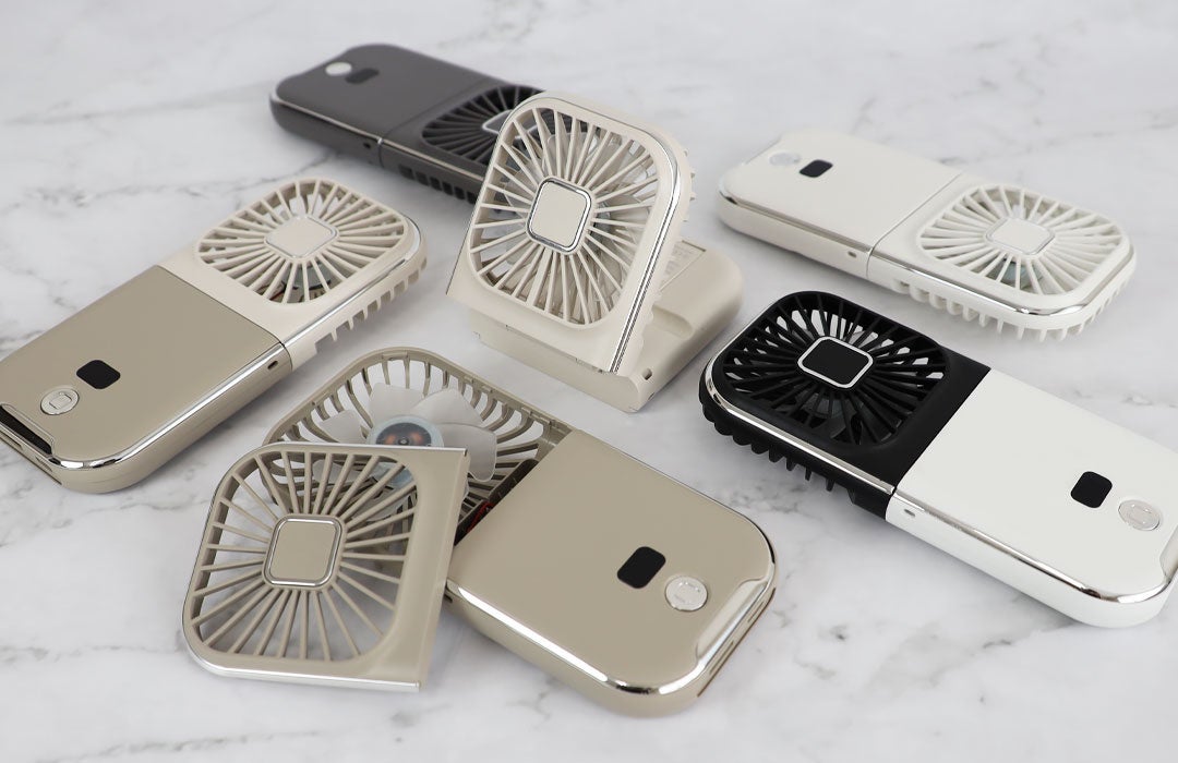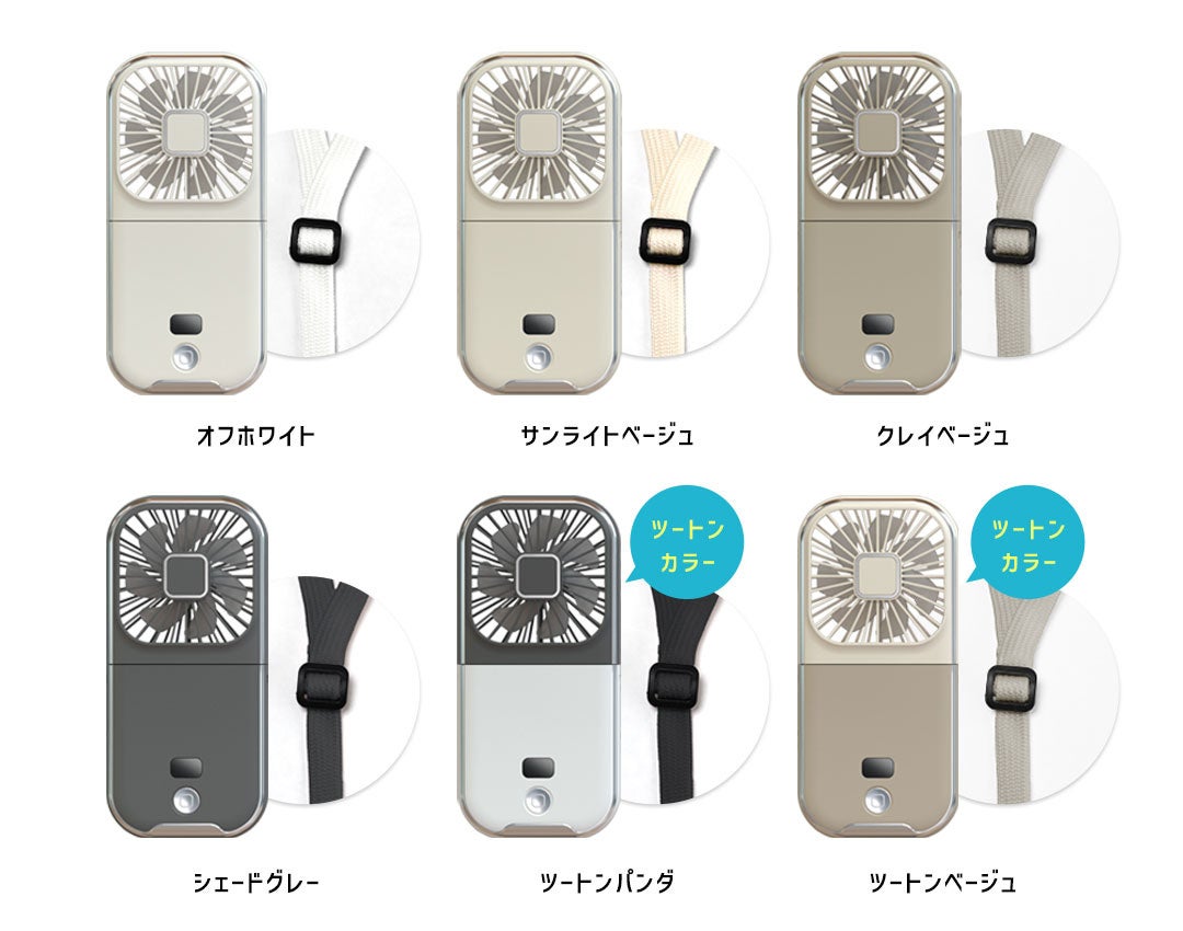 ハンディ、卓上、スマホスタンド、首掛け、モバイルバッテリーとシーンに合わせて5通りの使い方ができるマルチファン。ボディには大人かわいいニュアンスカラーを採用し、さらに2色の組み合わせを楽しめるツートンカラーも今夏から登場しました。