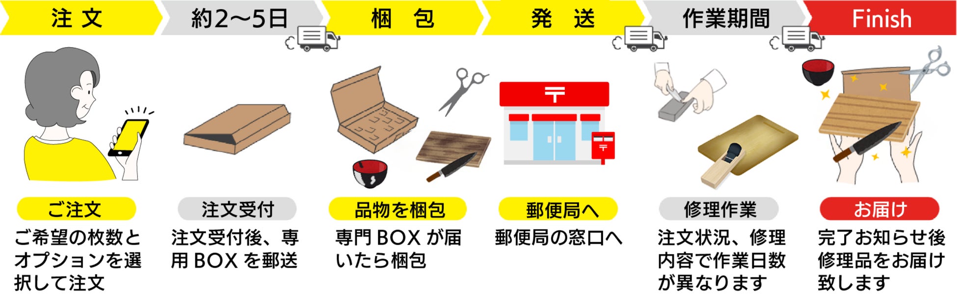 例えば包丁研ぎの場合、包丁を入れた専用BOXをポストに投函してから約1週間でスパッと切れる包丁が手元に届きます。価格は1本3,000円~です。