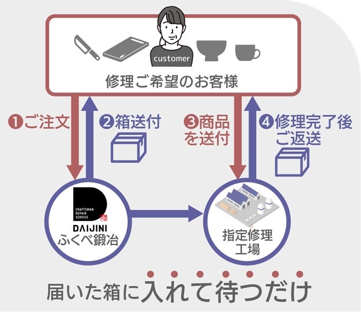 DAIJINIは、ご注文後に届く箱に修理対象の道具を入れてポストに入れるだけ。専門の職人が修理をし、返送します。幅広い年齢の方にご利用いただきたいため、手順はシンプルに特化しました。私たちの独自性と強みは、修理に出す事の手軽さにあります。