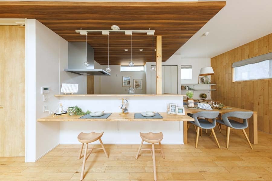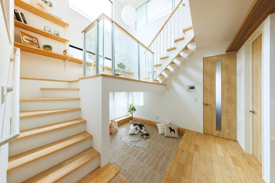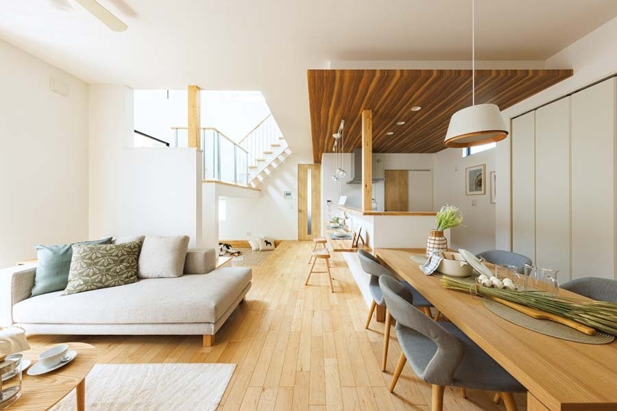 高台の開放的でゆとりある区画に建つのは、黒×白の外壁のコントラストが美しい住まい。室内は上質な木の風合いで仕上げた温もり溢れる空間です。子どもたちの創造性や学びを育むデザインとして、2021年キッズデザイン賞を受賞。スキップフロアの下はピットキッズフロアとして有効活用し、空間をゆるやかにつなぐスキップフロアと、家族の交流を自然と育むスキップライブラリーを設けています。