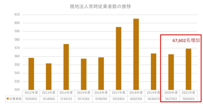 経済産業省 第52回海外事業活動基本調査によると、海外現地法人の従業員数は2019年に新型コロナウィルスの影響により減少しましたが、徐々に回復傾向にあり、2021年度末における現地法人の従業者数は約569万人、前年度比+1.2%となりました。