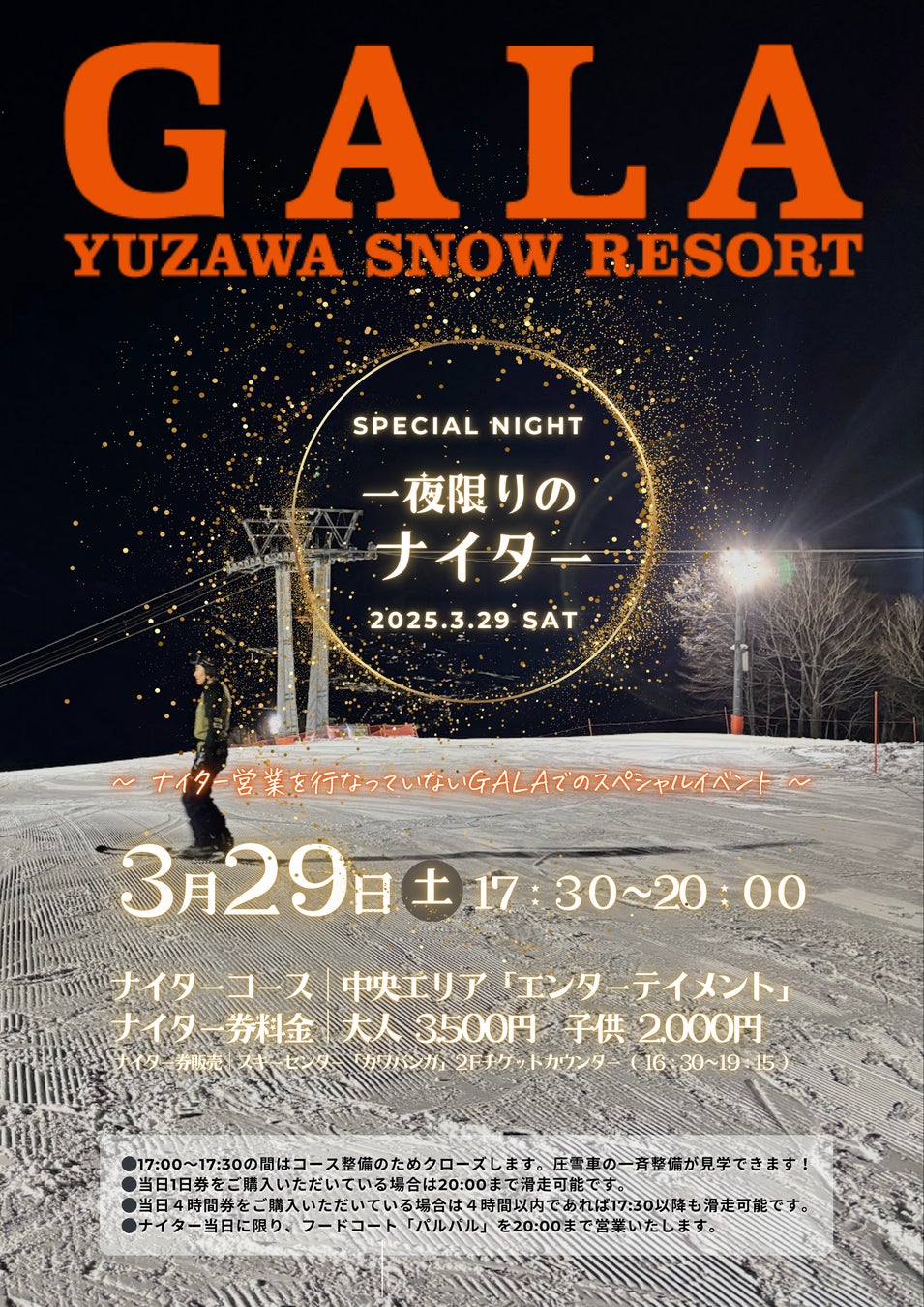 2025年3月29日(土)GALA湯沢スキー場では、一夜限りのナイター営業を行うことが決定しました!