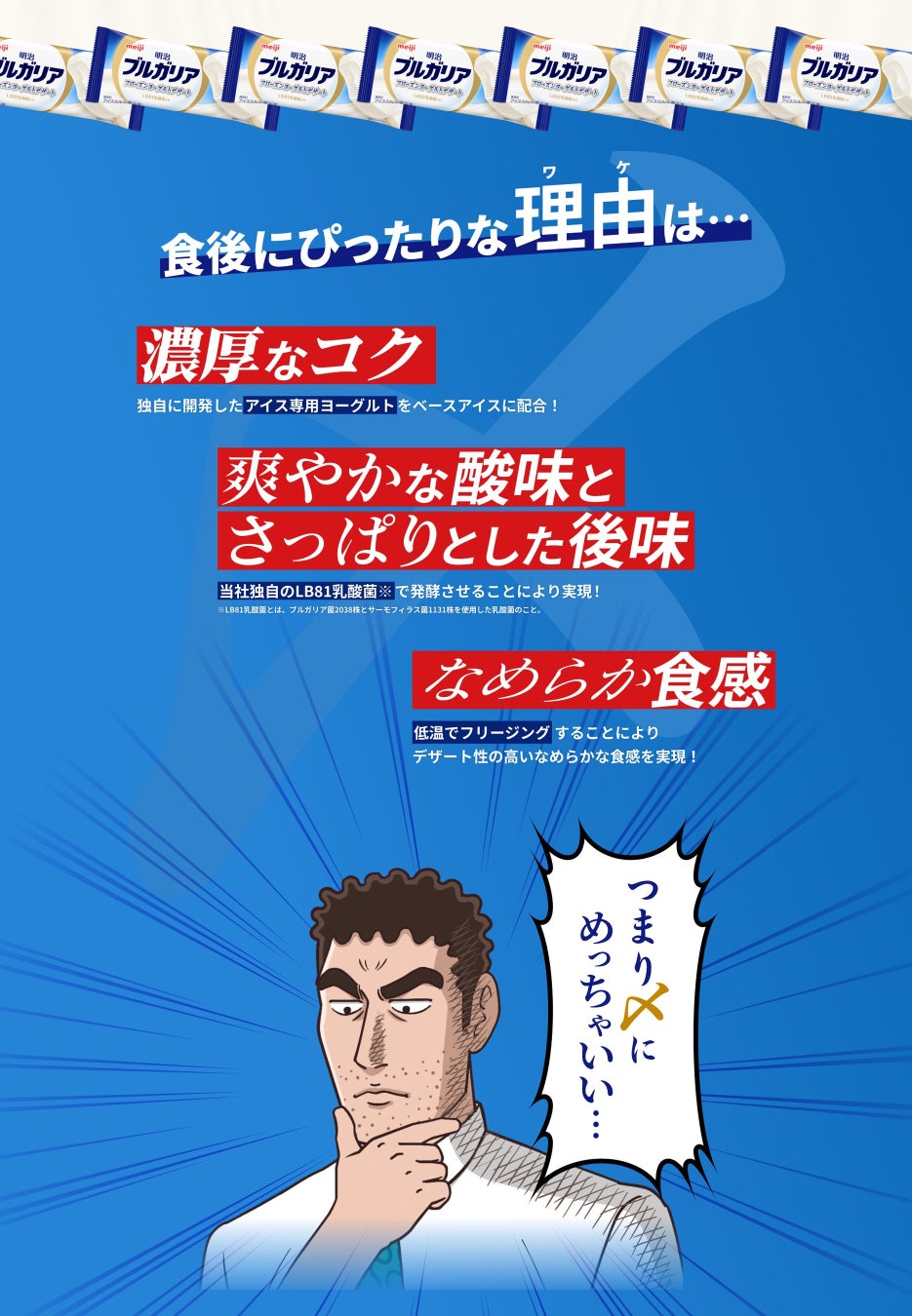 「明治ブルガリア フローズンヨーグルトデザート」は、忙しいサラリーマンでも手軽に購入でき、ひろしの食後の流儀である〆アイスを楽しめる一品です。