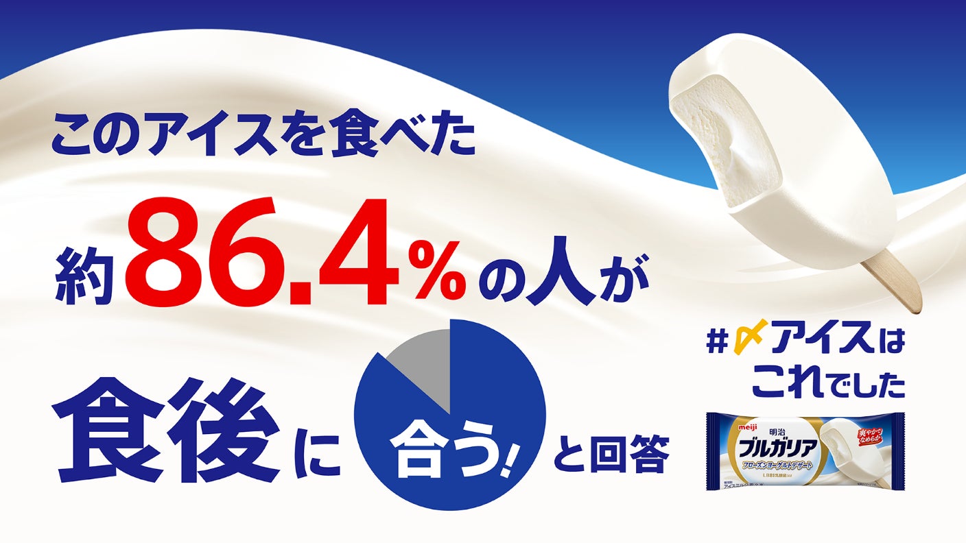 また、株式会社 明治が一般社団法人日本味覚協会の協力のもと、20代~50代の男女118名を対象に「食後に合うアイス」に関する調査を実施したところ、約86.4%※1の人が「明治ブルガリア フローズンヨーグルトデザート」を食後※2に合うアイスだと回答しました。喫食者からは「あらゆる類の食事の後でも、口直し的な位置付けとして幅広く受け入れられる味だと思う」「さっぱり感と濃厚さの両方を感じられて合う」「クリーミーだけどさっぱりとした酸味があり、食後に食べるアイスとして満足感がある」といった声が寄せられました。