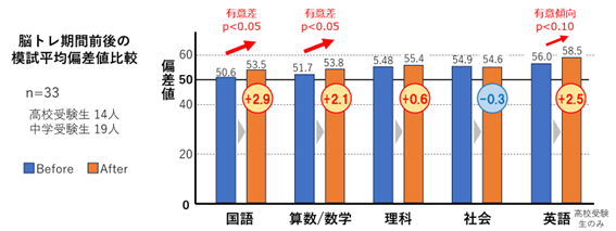 合格脳トレを2カ月間モニター利用していただいた結果、中学受験生と高校受験生、計33人において、特に国語と算数・数学、英語(高校受験生のみ)の偏差値が有意に向上することが確認されました。